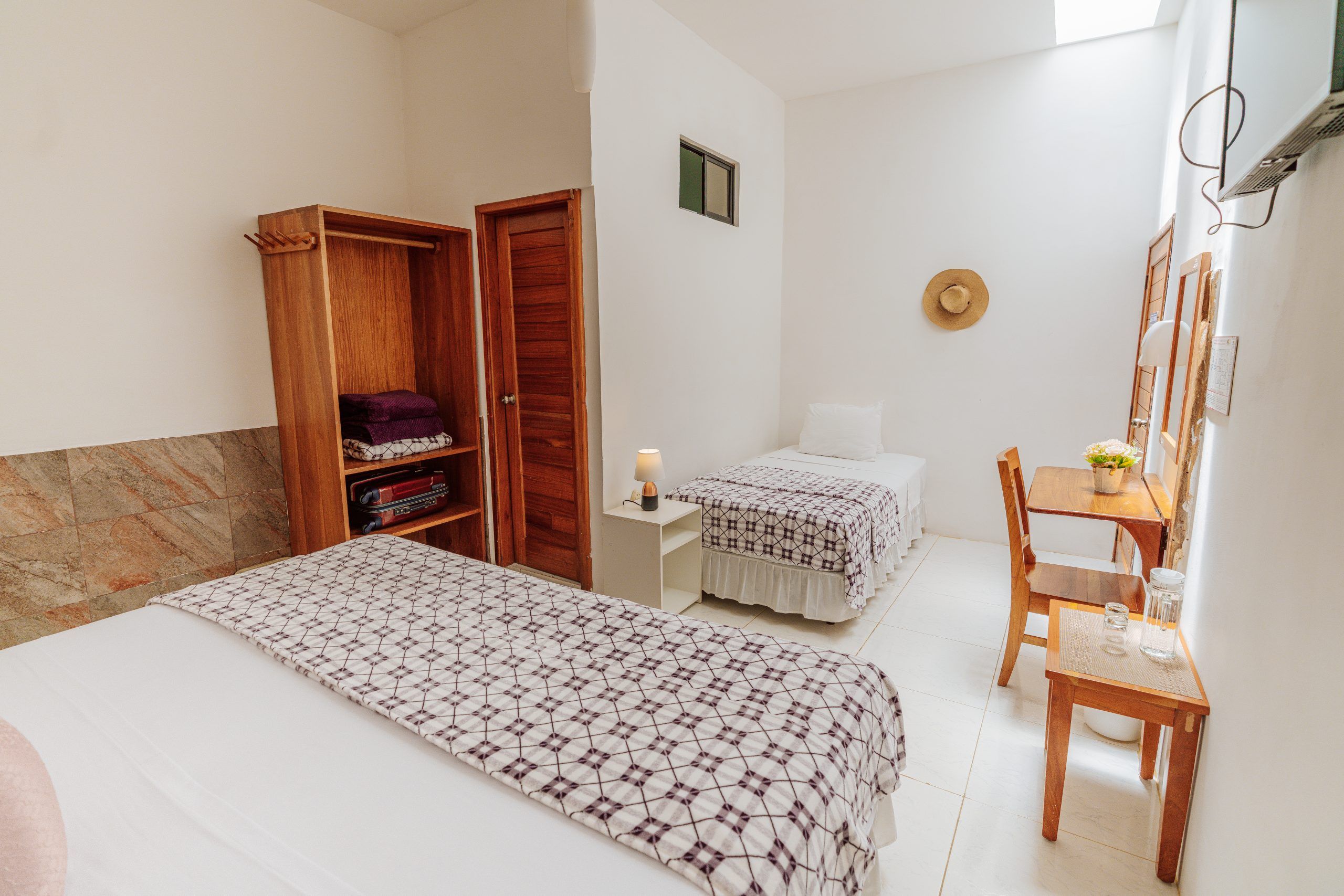 Nuestra habitación amplia y versátil está diseñada para alojar cómodamente hasta cuatro personas, con la posibilidad de configurarse como doble, triple o cuádruple según las necesidades de cada huésped. Su ambiente funcional y acogedor la convierte en la opción ideal tanto para familias como para grupos de amigos que buscan una estancia placentera.