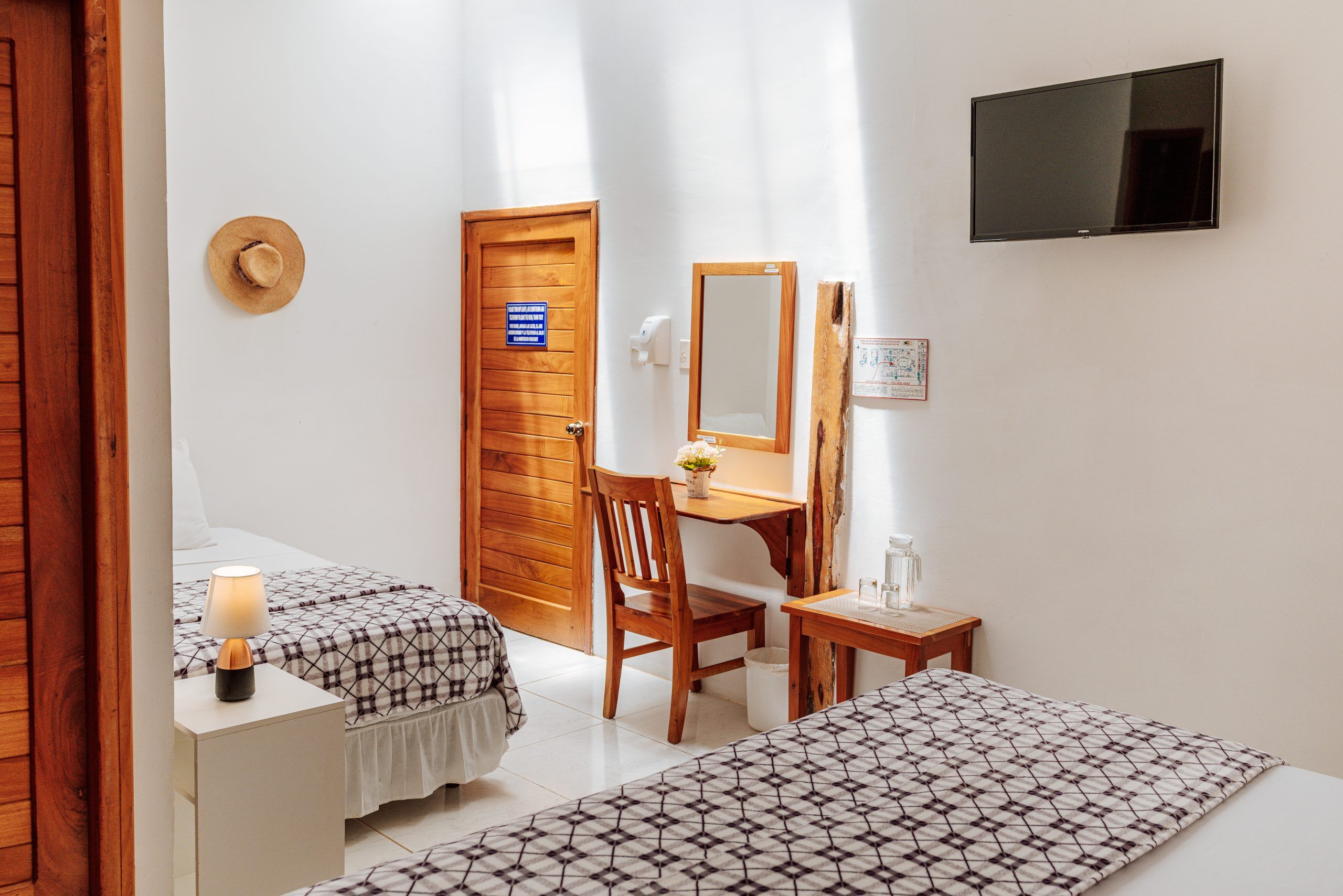 Para mayor comodidad, la habitación incluye una jarra de agua dulce de uso permanente, fácilmente recargable en los dispensadores disponibles, acompañada de sus vasos. También dispone de un práctico espejo, mesita, aire acondicionado y servicio de televisión por cable, garantizando un nivel superior de confort durante toda la estadía.